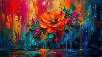 Een krachtig, eigentijds abstract schilderij met een stralende oranje bloem die uitbarst tegen een dramatische verticale achtergrond in rood, geel, blauwgroen en diepblauw. Dynamische verfspatten en gestructureerde penseelstreken creëren energie en beweging, terwijl de donkere, reflecterende basis diepte en contrast toevoegt. Dit…
