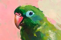 Levendige kleuren en een nieuwsgierige blik vangen de levendigheid van een groene papegaai die schittert in zachte penseelstreken. De harmonieuze combinatie van natuur en kunst voegt frisheid toe aan elke kamer, ideaal voor de woonkamer, waar het oog voor detail en een vleugje exotisch creëert.