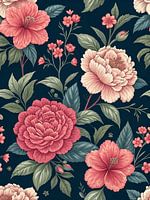 Een levendig en elegant naadloos patroon met grote, levendig gekleurde pioenrozen en kleinere bloemenaccenten tegen een diepe, donkere achtergrond. De gedetailleerde illustratie toont weelderige bloemblaadjes in roze en koraal tinten, aangevuld met rijke groene bladeren, waardoor een klassiek en weelderig bloemenontwerp ontstaat dat geschikt is voor verschillende decoratieve toepassingen zoals behang, stof of digitale achtergronden.