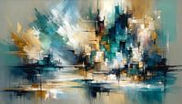 Dit kunstwerk is een levendige weergave van kleuren, waarbij teal (groen/blauw), crème, goud en diepblauw samensmelten tot een harmonieus palet. Het vangt de essentie van krachtig penseelwerk en de genuanceerde interactie van texturen, en creëert een evenwicht tussen dikke lagen verf en delicate wassingen. Het stuk valt op door zijn…