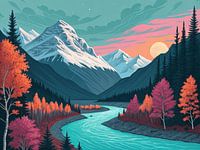Een gestileerd digitaal schilderij van een majestueus berglandschap bij zonsondergang, met besneeuwde toppen, een kronkelende turquoise rivier en een bos van herfstkleurige bomen in oranje, roze en donkergroene tinten. De lucht is geschilderd met zacht blauw en dramatische roze en oranje tinten terwijl de zon onder de horizon zakt en een warme gloed over het tafereel werpt.