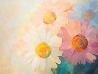 Levendige Bloem Schilderij - Dit is een abstract bloemenschilderij waar je levendige, grote bloemen ziet met zachte, versmelten kleuren die variëren van wit, geel, roze tot blauw, geschilderd in brede penseelstreken.