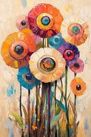 Levendige Bloemen Pracht - Dit is een kleurrijk bloemen schilderij waarin grote, levendige bloemen met dikke en expressieve verfstreken zijn afgebeeld op een lichte achtergrond, wat een vrolijke en dynamische indruk geeft.