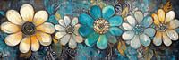 Levendige Bloementexturen Kunst - Dit abstracte bloemenschilderij toont een levendig tableau van grote geschilderde bloemen in overwegend blauwe en gele tinten, elk met gedetailleerde centra die lijken op kleine juwelen, en een achtergrond die textuur en donkere tinten gebruikt om diepte te creëren.