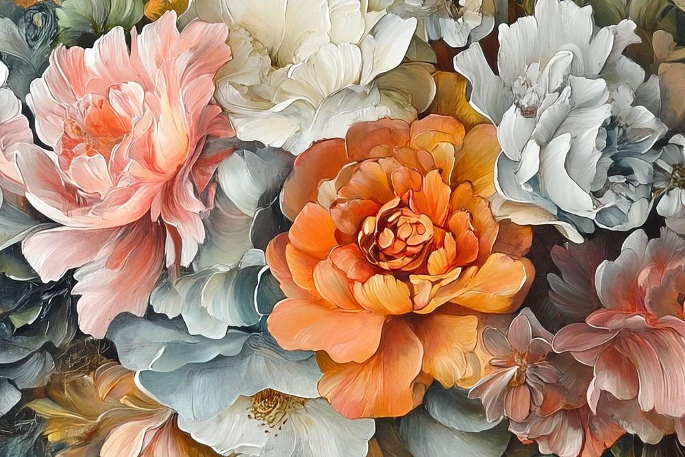 Details: bloemenschilderij, realistische bloemen, levendige kleuren, weelderige tuin, kunst, natuur, flora, realisme, bloemenkunst, rococo