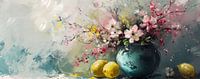Levendige Bloesem - Dit charmante stilleven brengt een moderne interpretatie van klassieke elementen, waarbij een vaas met wat lijkt op bloesemtakken en citroenen sfeer schept. De losse penseelstreken en de contrasterende, levendige kleuren tegen een gedempte achtergrond geven het een frisse, dynamische uitstraling. Let op hoe het spel…