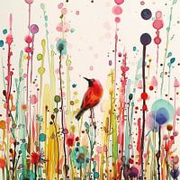 Levendige en kleurrijke abstracte weergave van de natuur. Het middelpunt is een rode vogel, zittend op wat lijkt op een tak, omgeven door een wilde explosie van kleuren en vormen. De achtergrond is opgebouwd uit talloze druppels, vegen en stippen die samen een gevoel van een bloeiend veld of weide oproepen. De kleuren variëren van warm rood en zacht roze tot koele blauwe en groene tinten, wat de diversiteit van de natuurlijke wereld symboliseert.