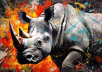 Levendige Neushoorn - Dit dynamische schilderij toont een krachtige afbeelding van een neushoorn, centraal geplaatst en gedetailleerd weergegeven tegen een abstracte achtergrond van felle oranje, rode en gele tinten, aangevuld met spatten van koelere blauwe en grijze verfstreken. Het contrast tussen het realisme van de neushoorn en de energieke, bijna graffiti-achtige achtergrond geeft het geheel een moderne, levendige uitstraling.