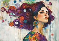 Levendige Oorbellen | Vrouw met Levendige Oorbellen - Op dit moderne vrouwenportret zie je een vrouw met expressieve, kleurrijke oorbellen en een levendige, kleurrijke haardos die opvalt door zijn verfijnde wirwar van paars, rood en blauw.