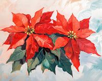 Levendige Rode Bloem Impressie - Dit Kerst schilderij toont een levendige kerstroos, prominent in felle rode tinten met donkergroene bladeren, geschilderd in een expressieve, bijna impressie-achtige stijl tegen een zacht, pastelkleurige achtergrond.