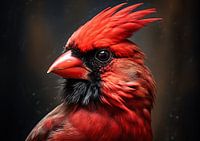 Levendige Rode Veren - Dit portret van een roodborstkardinaal toont het dier in prachtig detail, waarbij de nadruk ligt op de levendige rode veren en de kenmerkende zwarte 'masker' om de ogen. De donkere achtergrond contrasteert sterk met de rode kleur van de vogel, wat een gevoel van diepte en focus creëert.