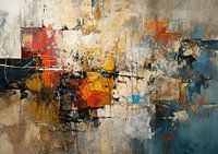 Levendige Ruïnes | Abstract Kleurrijk - Dit abstracte schilderij danst met texturen en lagen, waarbij gedurfde kleuren zoals diepblauw en levendig oranje samensmelten met subtiele neutrale tonen. Het herinnert aan verweerde muren met hints van een levendige geschiedenis, terwijl intrigerende krassen en lijnen een dynamische energie toevoegen.