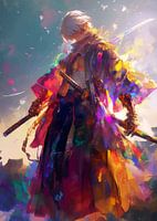 Een samoeraikrijger staat majestueus, badend in een spectrum van levendige kleuren die om hem heen lijken te stromen en te dansen. Zijn hoofd is versierd met wapperende witte haren en hij houdt zijn zwaard in een houding die kracht en paraatheid uitstraalt. Het gewaad dat hij draagt is een caleidoscoop van tinten, waarin rood, blauw,…