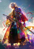 Een samoeraikrijger staat majestueus, badend in een spectrum van levendige kleuren die om hem heen lijken te stromen en te dansen. Zijn hoofd is versierd met wapperende witte haren en hij houdt zijn zwaard in een houding die kracht en paraatheid uitstraalt. Het gewaad dat hij draagt is een caleidoscoop van tinten, waarin rood, blauw, paars en geel naadloos in elkaar overgaan. Licht en schaduwen spelen over de scène en creëren een etherische en dynamische sfeer die contrasteert met de gedetailleerde, formidabele aanwezigheid van de krijger. De achtergrond suggereert een mystieke of abstracte omgeving, waardoor de prominente aanwezigheid van de krijger en het kleurrijke aura dat hem omringt nog meer benadrukt wordt.