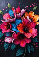 Dit prachtige werk is een betoverende mix van abstract expressionisme en levendig realisme, met een dynamisch boeket bloemen tegen een donkere, dramatische achtergrond. De rijke, impasto textuur creëert een gevoel van diepte en beweging, waarbij elk bloemblaadje lijkt te barsten van leven. Een caleidoscoop van kleuren - diep fuchsia,…