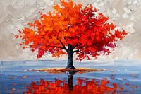 Dit prachtige schilderij vangt de essentie van de herfst met zijn levendige kleuren en dynamische penseelstreken. De schitterende rode en oranje bladeren contrasteren prachtig met de koele blauwe tinten van het water, waarin de boom weerspiegeld wordt. De abstracte stijl geeft een moderne twist aan het klassieke thema van de natuur, waardoor dit kunstwerk perfect past in een eigentijds interieur. Hang het in je slaapkamer of kantoor voor een vleugje kleur en inspiratie. Dit schilderij is niet alleen een visueel genot, maar ook een statement piece dat een gevoel van rust en contemplatie oproept. Ideaal voor kunstliefhebbers die houden van levendige en expressieve kunstwerken.