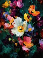"Vibrant Bloom" is een abstract bloemenschilderij met een rijke reeks kleurrijke bloemen in geel, roze, paars en wit tegen een donkere groenblauwe achtergrond.