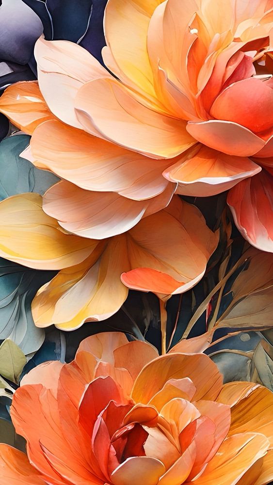 Levendige en artistieke illustratie met een boeket grote, gedetailleerde bloemen. De algehele stijl is een mix van realisme en abstractie, met complexe details op de bloemblaadjes en bladeren, die een gevoel van diepte en textuur creëren. De afbeelding straalt elegantie en natuurlijke schoonheid uit, met een dynamische flow die wordt gecreëerd door de compositie van de bloemenelementen.