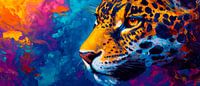 In een fascinerend samenspel van kleuren en vormen valt de majestueuze kop van een jaguar op, met zijn mysterieuze ogen. De levendige, heldere tinten geven het kunstwerk een dynamische energie die elke kamer zal verlevendigen. Ideaal voor een woonkamer die uitnodigt tot levendige gesprekken en creatieve inspiratie.