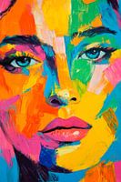 De foto toont een indrukwekkend portret van een vrouw dat fascineert door de levendige, krachtige kleuren. Het veelzijdige kleurenschema in blauw, roze, geel en groen geeft het gezicht een dynamische diepte. De expressieve ogen en opvallende lippen zijn bijzonder opvallend en brengen de hele compositie tot leven.