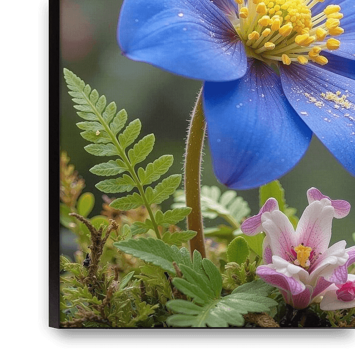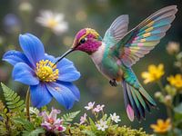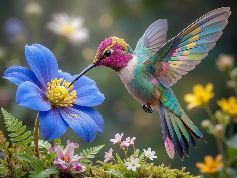 Een kleurrijke kolibrie drinkt voorzichtig nectar uit een prachtige blauwe bloem.