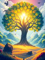 Een levendige en weelderige boom met een stralende, gouden gloed in het midden, omringd door rotsen en een kleurrijk landschap, dat het leven symboliseert.