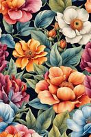 Een rijke en gedetailleerde illustratie met een overvloed aan bloeiende bloemen in een divers kleurenpalet, waaronder warm oranje, diep rood, zacht blauw en helder wit, tegen een donkere, mogelijk zwarte achtergrond. De kunst benadrukt de ingewikkelde texturen van bloemblaadjes en bladeren, waardoor een weelderig en meeslepend…