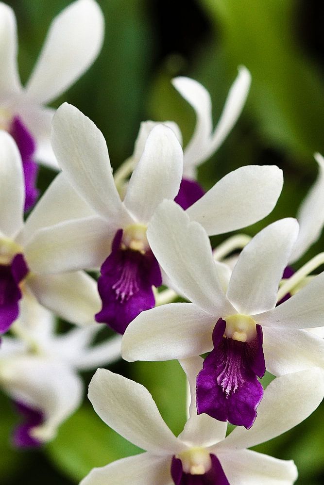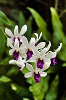 Deze tropische orchideeën, met hun smetteloze bloemblaadjes en intens paarse hart, belichamen de elegantie en finesse van de natuur. Het zuivere wit van de buitenste bloemblaadjes contrasteert prachtig met de fluweelachtige diepte van het centrale violet, waardoor een betoverende visuele harmonie ontstaat. Deze delicate bloemen lijken te zweven in de lucht, ondersteund door slanke stelen, alsof ze zweven in een groene omgeving. Hun symmetrische vorm en contrasterende tinten springen onmiddellijk in het oog en roepen de perfectie op van een natuurlijk kunstwerk. Gefotografeerd tegen een achtergrond van zachtgroen gebladerte, springen ze er schitterend uit en vangen ze al het licht op. Deze bloemencompositie geeft een gevoel van frisheid en sereniteit, terwijl het exotische van de regenwouden waar ze gedijen wordt opgeroepen. Elke bloem, uniek in haar detail, draagt bij aan een geheel van rustgevende, verfijnde schoonheid. Het is een beeld dat uitnodigt tot contemplatie en een herinnering aan het vermogen van de natuur om eenvoud en verfijning te combineren in haar creaties.