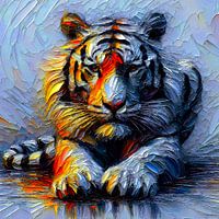 De tijger ligt ontspannen met uitgestrekte voorpoten en straalt zowel kracht als kalmte uit. Een dynamisch kleurenspectrum van vurige oranje tinten, diep blauw en zacht grijs…