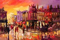 Dit kleurrijke en expressieve schilderij brengt een bruisende stad tot leven tijdens de schemering. Met warme tinten van rood, geel en oranje, wordt de drukke straat vol mensen en paardenkoetsen sfeervol weergegeven. De weelderige penseelstreken geven een dynamisch gevoel aan de straten, terwijl de architectuur van de gebouwen prachtig contrasteert met de kleurrijke lucht op de achtergrond. Dit kunstwerk is ideaal voor liefhebbers van levendige stedelijke scènes en voegt een vleugje energie toe aan elke ruimte. Een perfect stuk om op te hangen in een woonkamer of kantoor voor een gevoel van beweging en stedelijke elegantie.