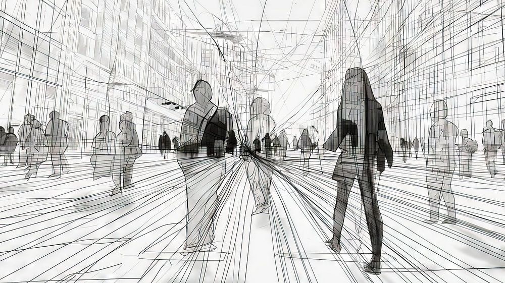 Dit kunstwerk toont een drukke stadsstraat met rondlopende mensen, gecombineerd met een abstracte architecturale schets in silhouetstijl. De mix van realistische figuren en abstracte gebouwvormen creëert een fascinerende visuele dynamiek. De mensen, afgebeeld in verschillende houdingen en bewegingen, brengen een gevoel van levendigheid en activiteit over, terwijl de architecturale silhouetten op de achtergrond een artistieke diepte aan het beeld toevoegen. De monochrome tinten en contrasterende lijnen van de gebouwen contrasteren met de levendige kleuren van de voorbijgangers, waardoor een interessante spanning ontstaat tussen realiteit en abstractie. Deze compositie spreekt iedereen aan die de combinatie van stedelijk leven en artistieke interpretatie waardeert en de esthetiek van het moderne stadsleven wil vastleggen.