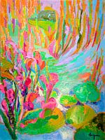 Dorothy Fagans 'Landscapes of the Heart' barsten van pure emotionele intensiteit. Haar abstracte schilderijen zijn een visuele explosie waarin de natuur is teruggebracht tot de meest essentiële krachten - beweging, kleur en energie. Dikke lagen verf dansen over het doek in ongetemd fuchsia, elektrisch turquoise en gloeiend oranje, waarbij elke penseelstreek een directe emotionele lading met zich meedraagt.