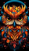 Een prachtige, hypergedetailleerde illustratie van een uil in levendige, psychedelische kleuren (oranje, blauw, rood) die een coole blauwe koptelefoon draagt. Een fusie van natuur en muziek.