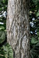 Deze meeslepende natuurfoto toont de krachtige verstrengeling van boomwortels die zich als levende aderen vastklampen aan de stam van een tropische boom. Het is een prachtig voorbeeld van de strijd en harmonie binnen de natuur, waar elke wortel zijn weg zoekt en tegelijk de boom ondersteunt. De subtiele kleurnuances en de robuuste…