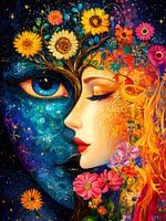 Dit schilderij is een betoverende en symbolische weergave van dualiteit en harmonie in de natuur. Het portretteert een twee vrouwengezichten, elk met een unieke kleurencombinatie en sfeer.