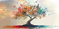 Dit levendige kunstwerk toont een boom die de essentie van het leven en de natuur symboliseert. De explosie van kleuren in de kroon vertegenwoordigt de diversiteit en constante verandering in de natuur en het leven. De stevige stam geworteld in een kleurrijk spectrum van grond suggereert stabiliteit te midden van transformatie. Het schilderij roept een gevoel van vreugde, vitaliteit en harmonie op, waarbij elk seizoen en elke levensfase wordt gevierd in een dynamische compositie van kleuren en vormen.