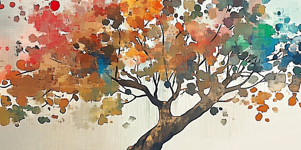 Dit levendige kunstwerk toont een boom die de essentie van het leven en de natuur symboliseert. De explosie van kleuren in de kroon vertegenwoordigt de diversiteit en constante verandering in de natuur en het leven. De stevige stam geworteld in een kleurrijk spectrum van grond suggereert stabiliteit te midden van transformatie. Het schilderij roept een gevoel van vreugde, vitaliteit en harmonie op, waarbij elk seizoen en elke levensfase wordt gevierd in een dynamische compositie van kleuren en vormen.