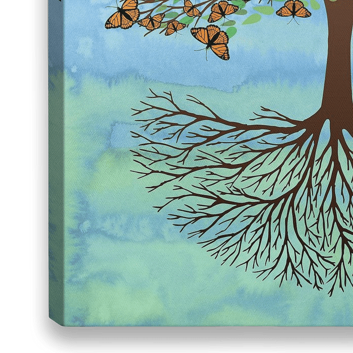 Een digitale tekening van een levensboom, waarbij de wortels ook zichtbaar zijn, met in de kroon van de boom oranje vlinders, monarch vlinders. Er zijn ook transparante groene blaadjes in de kroon zichtbaar. De achtergrond is een aquarel die de lucht en de grond weergeven.