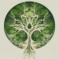 Een gestileerde levensboom vormt het hart van deze ronde, symmetrische compositie. De wortels en takken spreiden zich uit in een complex patroon dat de hele cirkel vult. Het kleurenpalet wordt gedomineerd door levendige blauw- en groentinten, wat een gevoel van vitaliteit en natuurlijke harmonie oproept. Het geheel heeft een mandala-achtige uitstraling en symboliseert verbinding en groei. Het is een betekenisvolle en visueel boeiende blikvanger, ideaal voor het creëren van een centraal punt van rust en balans in een ruimte.