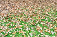 Gevallen bruine bladeren in De Hout de Alkmaar. Het oudste stadspark van Nederland. De herfst komt eraan. Het gras is nog mooi groen. Eikenbladeren. Einde zomer. Verval, bruin, vergankelijkheid, seizoenen. Wijziging van de seizoenen.