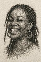 Het portret is opgebouwd uit vele losse zwarte draadjes, die het werk een speels karakter geven. Samen creëren ze een levendig beeld vol textuur en beweging. Het onderwerp toont subtiele dichtheden, vooral rond het haar, de schaduw in haar hals en de glinstering in haar ogen. De achtergrond van handgeschept papier geeft het werk een warme, natuurlijke basis.