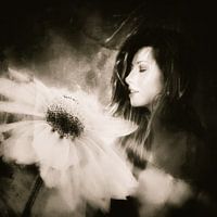 Joie de vivre - een jonge vrouw met gesloten ogen. Een zomerbloem op de voorgrond, misschien geniet ze van de zonnestralen op haar gezicht? Of is het een herinnering die haar gelukkig maakt? Het blijft onze eigen interpretatie!