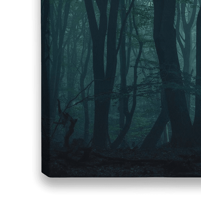 Een mysterieus bos gehuld in dikke nevels met zwarte vormen die oude bomen omlijnen. Speulderbos, Nederland (2017)