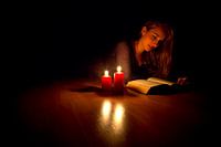 Lezen met kaarslicht.