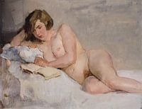Lezend naakt op bed, nog een liggend naakt van Sjaantje van Ingen, lezend in een boek.