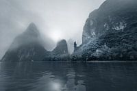 Koop dit landschapskunstwerk Li rivier met Karst gebergte in de mist, China in zwart wit van Ruurd Dankloff op canvas, aluminium dibond, (ingelijste) fotoprint, behang en ArtFrame, op maat geprint in Fine-Art kwaliteit.