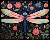 Libel | Bloemen Insect Kunst - Dit schilderij schittert met een gracieuze libel centraal tegen een donkere achtergrond, omgeven door een rijke mozaïek van florale motieven. De libelvleugels zijn gedetailleerd met sierlijke patronen in warme tinten roze en geel, wat een charmante folkloristische stijl oproept. Het geheel biedt een boeiend contrast tussen de diepzinnige achtergrond en de uitbundige, levendige bloemen en insect.