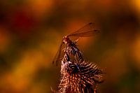 Tijdens de ondergaande zon waren er veel libellen te zien. Doordat ik met een zeer grote lens fotografeerde is er een fraaie bokeh ontstaan met een geheel in mooie herfstkleuren.