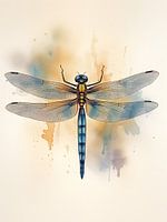 Bovenaanzicht van een libel met achtergrond in aquarel stijl, zachte warme kleuren.