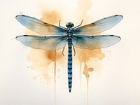 Bovenaanzicht van een libel met achtergrond in aquarel stijl, zachte warme kleuren.